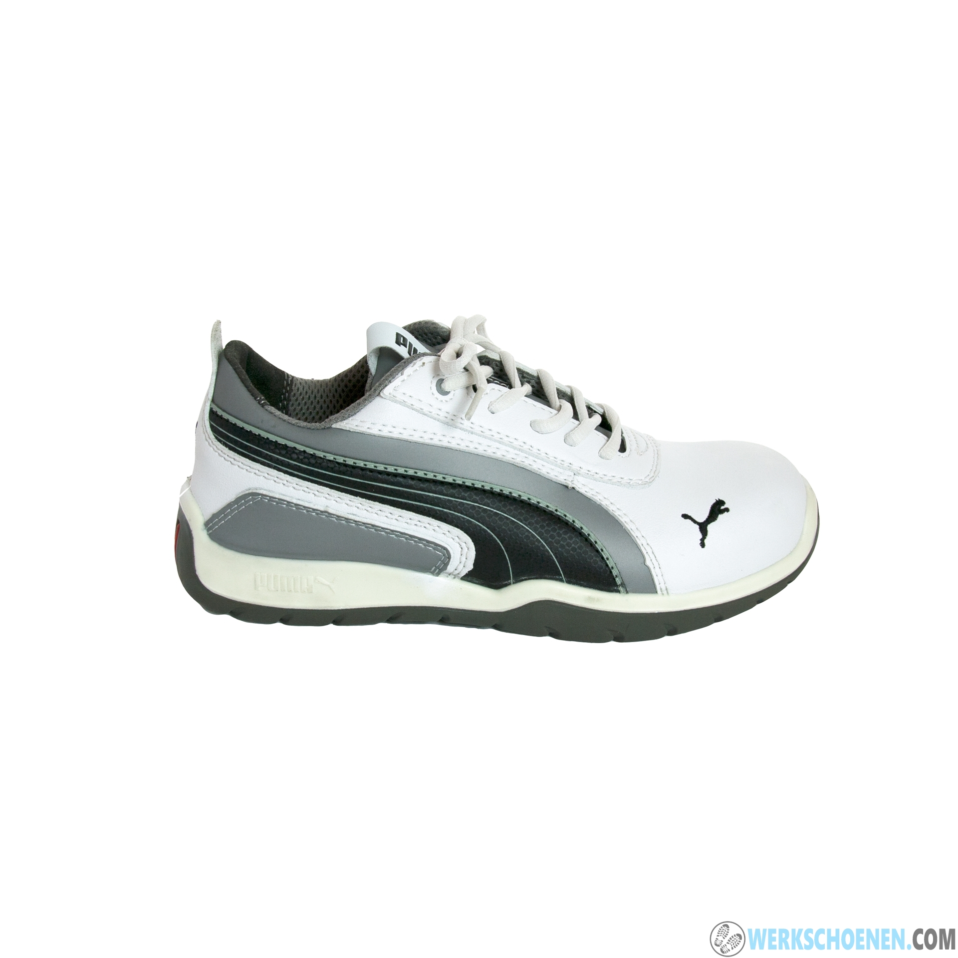 De Puma Race 64265 is een opvallende werkschoen. Dit komt door zijn witte uiterlijk in combinatie met de grijze accenten welke de schoen een sportieve uitstraling geven. De bovenzijde van de werkschoen is gemaakt van ademend volnerf leder, wat gemakkelijk schoon te houden is. Deze witte veiligheiddschoen heeft niet alleen een trendy uiterlijk maar is ook nog eens S3 genormeerd. Dit betekent onder andere dat de schoen een composiet veiligheidsneus en kevlar tussenzool heeft. Dankzij de voering, welke een hoge vochtabsorptie en vochtdoorvoer heeft, houdt u lang droge voeten. De metaalvrije veiligheidsschoen is uitgerust met een ICELL motorsport loopzool. Deze loopzool is bestand tegen een contactwarmte van wel 300 graden Celsius. Daarnaast is het voetbed waarop u loopt anatomisch vormgegeven. Er zit een steunzool en gelkussen in de hak en het voetbed is gemaakt van antibacterieel materiaal. Het gelkussen in de hak is verwijderbaar en wasbaar op een temperatuur van 30 graden Celsius. De Puma Race 64265 is geschikt voor zowel dames als heren en is verkrijgbaar in de maten 37 tot en met 47 en is geschikt voor werk in onder meer het transport, de foodsector, horeca en het magazijn.